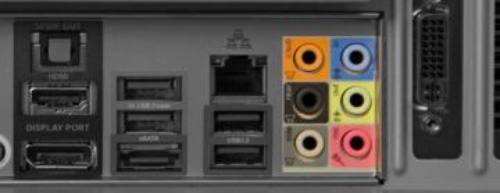 Portas analógicas: são as mais usadas, e codificadas por cor para que você saiba onde plugar cada componente (caixas de som, microfone, subwoofer, etc). Se você é um dos raros usuários com um sistema de som com múltiplos canais no PC, provavelmente usará três ou quatro destas portas: geralmente a verde, preta, laranja e cinza. Microfones são plugados na porta rosa, e a azul é a entrada de linha. Se você tem simples caixas de som estéreo, ligue-as na porta verde.