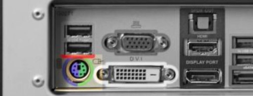 Porta PS/2 para mouse ou teclado: é o mais comum entre as portas antigas. A maioria das placas-mãe com portas PS/2 tem duas delas, embora em alguns casos haja apenas uma, como na foto acima. Por convenção o teclado é plugado na porta roxa, e o mouse na verde (os conectores usam cores correspondentes, para evitar confusão).